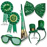 Complete St. Patrick’s Day party pack includes St. Patrick’s Day Light up Glasses, Giant Bow Tie, Award Ribbon Pin, Mini Hat Headband, & Horn on a Chain!